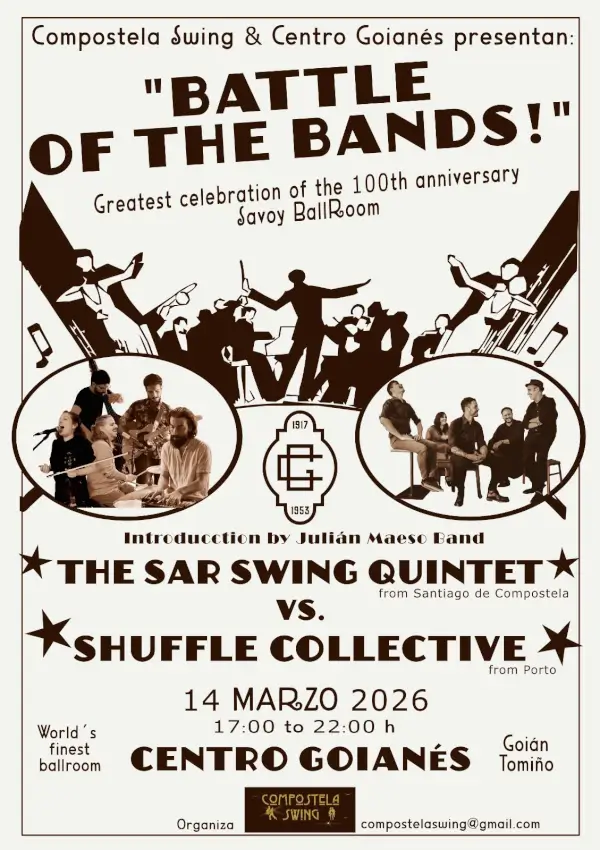 Celebración del 100 aniversario del Savoy Ballroom con un «Battle of the Bands!» y Swing Gathering de las escenas de Swing de Galicia y Norte de Portugal. Contará con la introducción de Julián Maeso Band y la batalla entre Sar Swing Quintet (Compostela) y Shuffle Collective (Porto). El evento se realizará el 14 de marzo de 2026 de 17:00h a 22:00h en el Centro Goianés, Goián (Tomiño, Pontevedra).