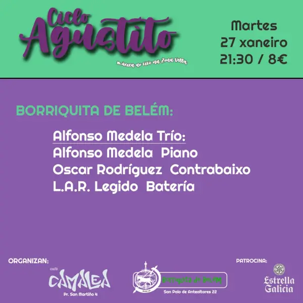Concierto del Alfonso Medela Trío, bajo el nombre Borriquita de Belém, como parte del Ciclo Agustito. El evento tendrá lugar el martes 27 de enero de 2026 a las 21:30h en el Café Camalea, Praza de San Martiño 4, Santiago de Compostela. El precio de la entrada es de 8€.