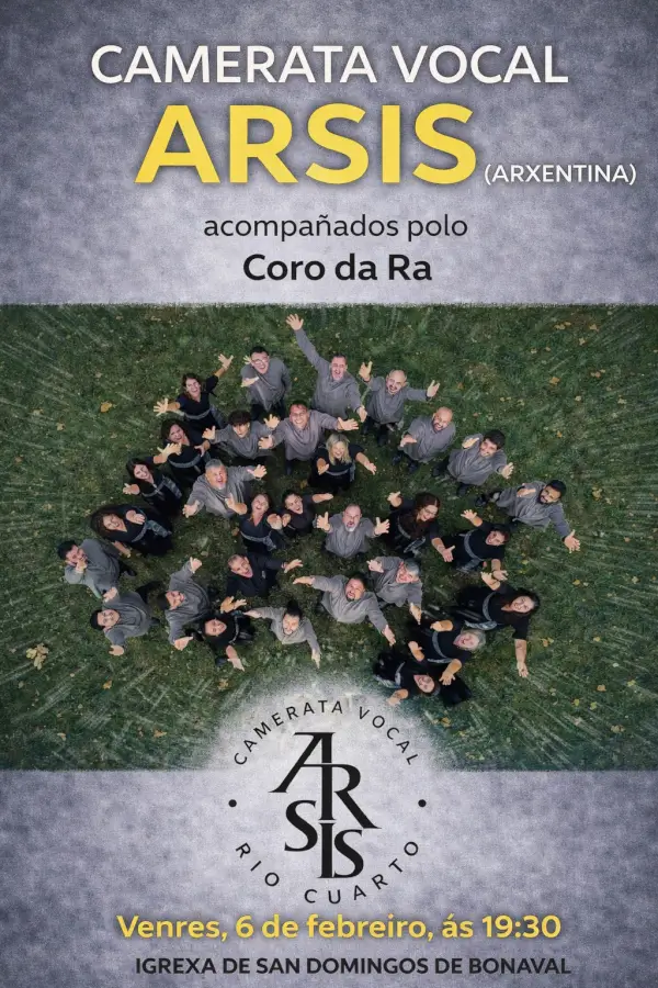Concierto de la Camerata Vocal Arsis de Argentina, acompañada por el Coro da Ra. El evento se realizará el 6 de febrero de 2026 a las 19:30h en la Igrexa de San Domingos de Bonaval, Santiago de Compostela.