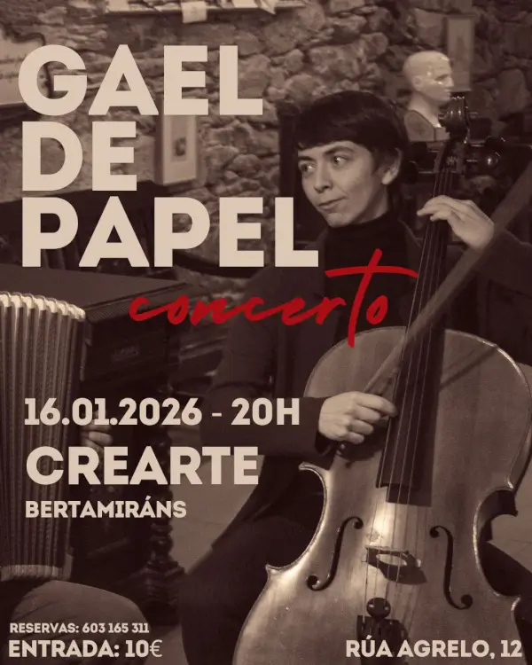 Concierto de Gael de Papel el 16 de enero de 2026 a las 20:00h en Crearte, Bertamiráns. La entrada cuesta 10€. Reservas al 603 165 311.