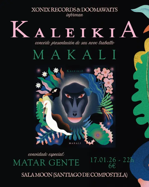 Presentación del nuevo álbum ‘Makali’ de Kaleikia, acompañados por Matar Gente. El concierto tendrá lugar el 17 de enero de 2026 a las 22:00h en la Sala Moon (Santiago de Compostela). La entrada tiene un precio de 6€.