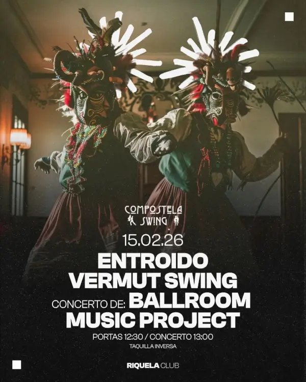 Evento de Entroido Vermut Swing con el concierto de Ballroom Music Project, organizado por Compostela Swing. Las puertas abren a las 12:30h y el concierto comienza a las 13:00h el 15 de febrero de 2026 en Riquela Club, Santiago de Compostela. La entrada es de taquilla inversa.