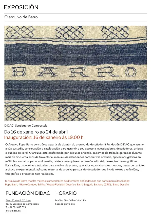 Exposición ‘O arquivo de Barro’ en la Fundación DIDAC, Santiago de Compostela. La inauguración tendrá lugar el 16 de enero de 2026 a las 19:00h. La exposición estará abierta al público hasta el 24 de abril de 2026 y presenta el archivo del diseñador Pepe Barro, incluyendo dibujos, cuadernos de trabajo, piezas multimedia y proyectos museográficos.