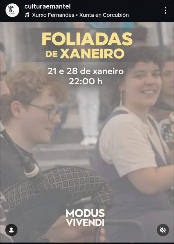 Foliadas de Xaneiro con la actuación de Modus Vivendi. El evento se realizará el 28 de enero de 2026 a las 22:00h en Santiago de Compostela.