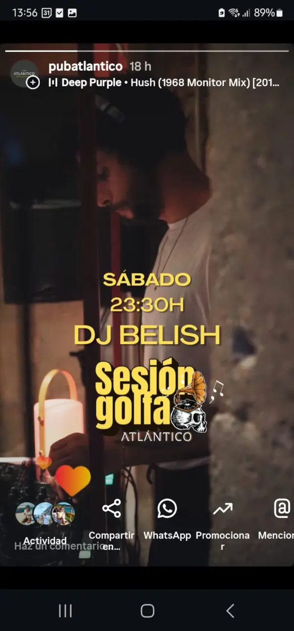 Sesión de música con DJ Belish el 17 de enero de 2026 a las 23:30h en Pub Atlántico.